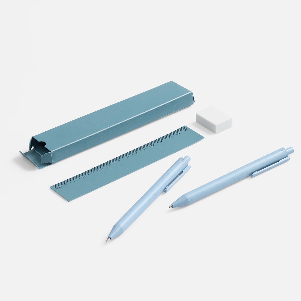 - В комплекте ручка, механический карандаш, линейка, ластик и упаковка.